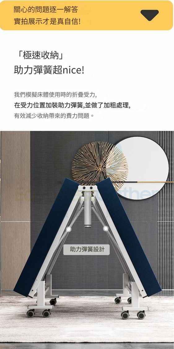 模擬床體使用時的折疊受力,在受力位置加裝輔助彈簧,並做了加粗處理,有效減少收納帶來的費力問題。