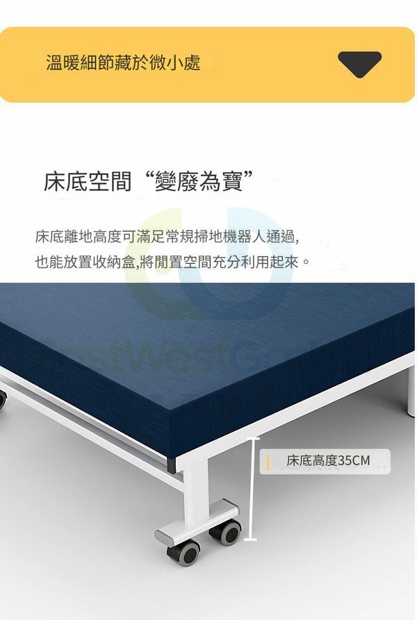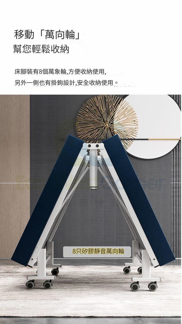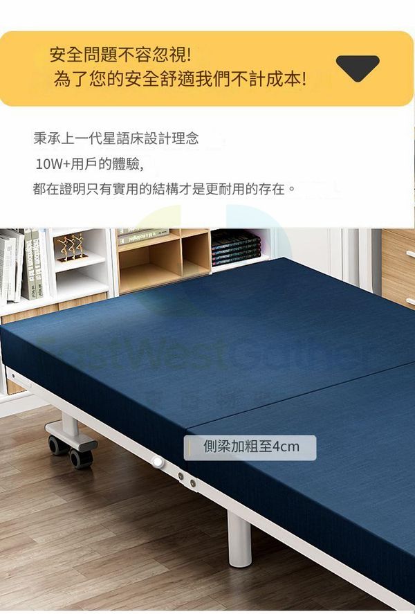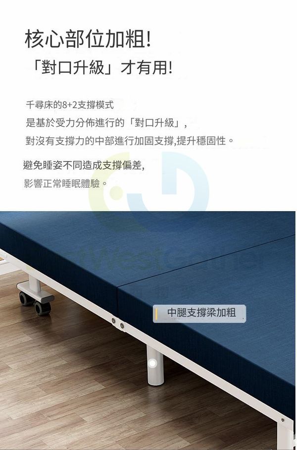 外側萬向輪帶鎖設計,床體中心受力區額外加裝兩條支撐腿