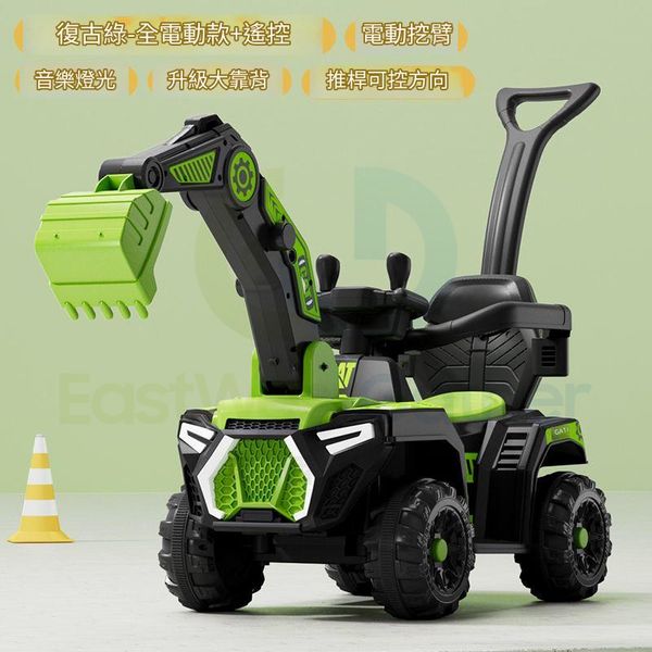 包送貨-兒童電動車 玩具遙控車挖掘機 Children electric car toy 全電型+圍欄推桿+遙控 電動+滑行兩用 绿色 移動方向盤工程車 模擬挖土機(N22171-11)