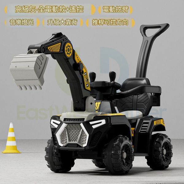包安裝送貨-兒童電動車 玩具遙控車挖掘機 Children electric car toy 全電型+圍欄推桿+遙控 電動+滑行兩用 灰色 移動方向盤工程車 模擬挖土機(N22171-30)