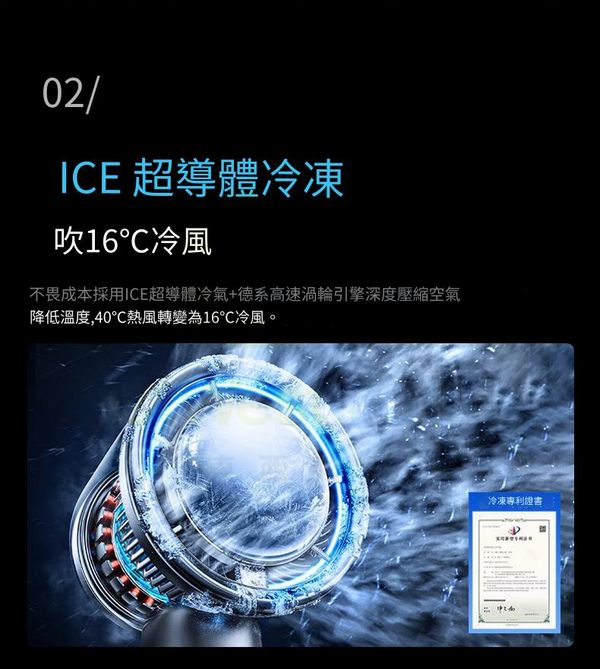 ICE 超導體冷凍+德系高速渦輪引擎,深度壓縮空氣,降低溫度,40C熱風轉變為16°C冷風。