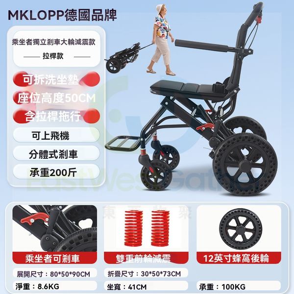 帶拉杆/乘坐者獨立煞車/減震大輪 包送貨-折疊輪椅 Folding wheelchair 飛機老人輪椅拉杆 家用手推車 摺疊看護輪椅 小型輕便(N22203-14)