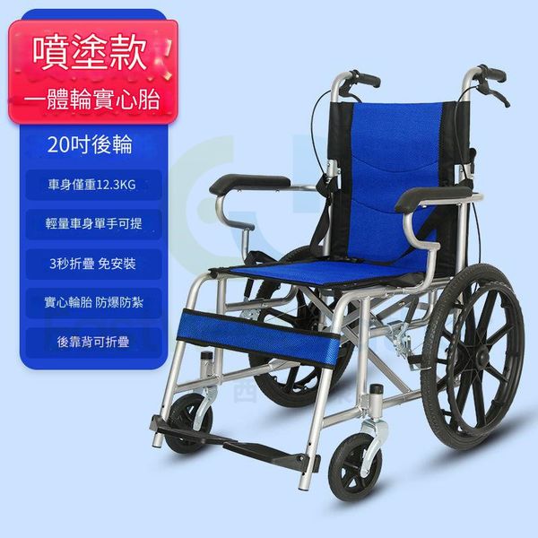20吋後輪-藍色升級款(可自行推) 包送貨-折疊輪椅 老人輪椅 Folding wheelchair 防震輪胎 看護輪椅 家用手推車 小型輕便(N22204-06)