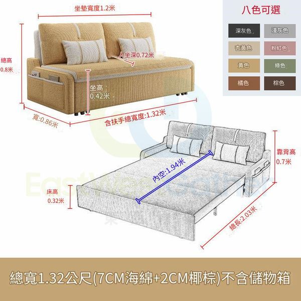 寬1.32米(7厘米海綿+2厘米椰棕) 包安裝送貨-梳化床 折疊儲物沙發床 Folding sofa bed 黃色 小戶型收納梳化 多功能兩用摺疊單人雙人床(N22206-173)