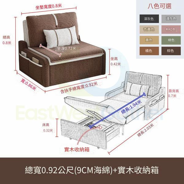 寬0.92米(9厘米海綿 帶儲物) 包安裝送貨-梳化床 折疊儲物沙發床 Folding sofa bed 棕色 小戶型收納梳化 多功能兩用摺疊單人雙人床(N22206-260)