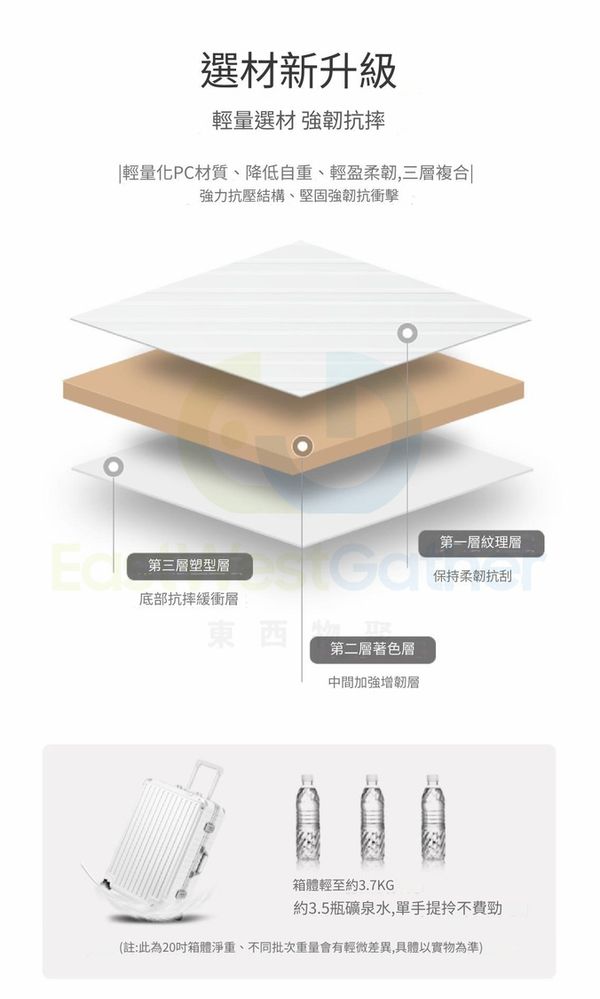 輕量化PC材質、降低自重、輕盈柔韌,三層複合強力抗壓結構、堅固強韌抗衝擊