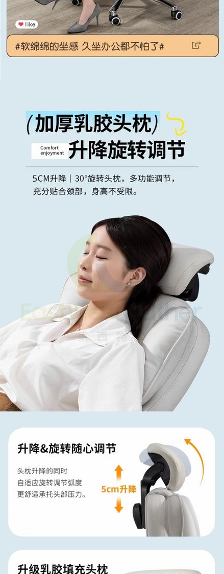 5CM升降|30°旋转头枕,多功能调节,充分贴合颈部,身高不受限。