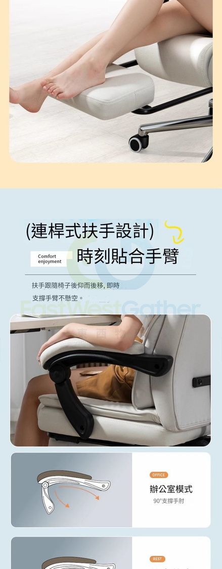 扶手跟隨椅子後仰而後移,即時支撐手臂不懸空。