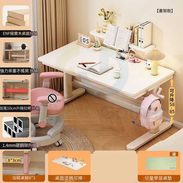 140x60x58cm實木升降桌[書架款] 兒童書檯 學生學習枱 書架收納 Childrens desk student chair 包安裝送貨-寫字枱套裝(N22375-12)
