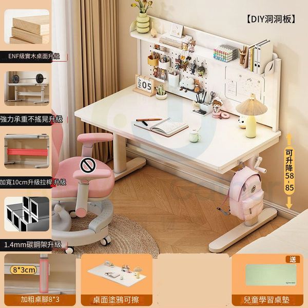 120x60x58cm實木升降桌[自由洞洞板] 兒童書檯 學生學習枱 書架收納 Childrens desk student chair 包安裝送貨-寫字枱套裝(N22375-19)