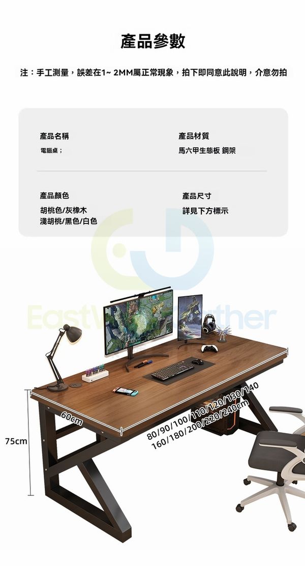 電腦枱 180x60x75cm 淺胡桃色+白架[加強版25MM]實木生態板 包送貨-電競遊戲桌 辦公枱 Computer desk 辦公桌 電腦桌(N22408-69)