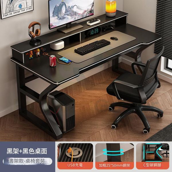 電腦枱 枱椅組合160x60x75cm 黑架黑面書架桌椅套裝-送USB充電 包安裝送貨-電競枱 遊戲檯 寫字枱 Computer desk 辦公枱 office 電腦桌(N22414-165)