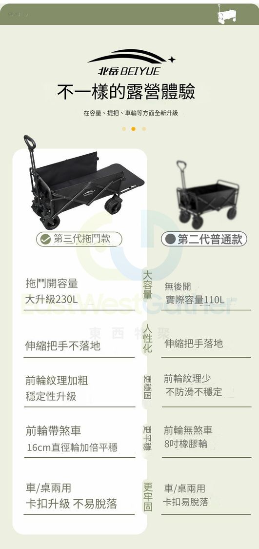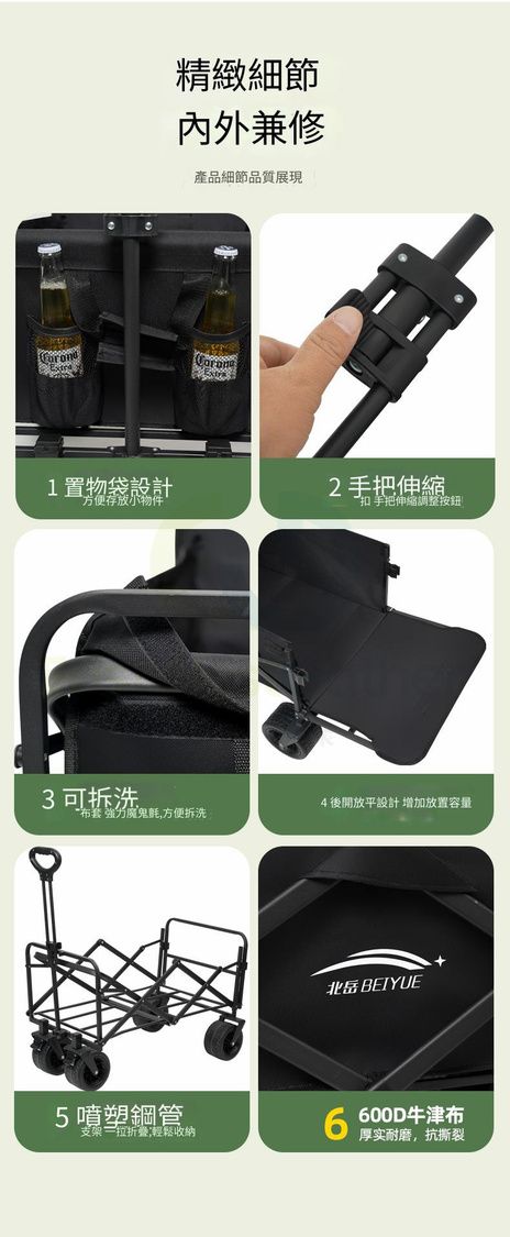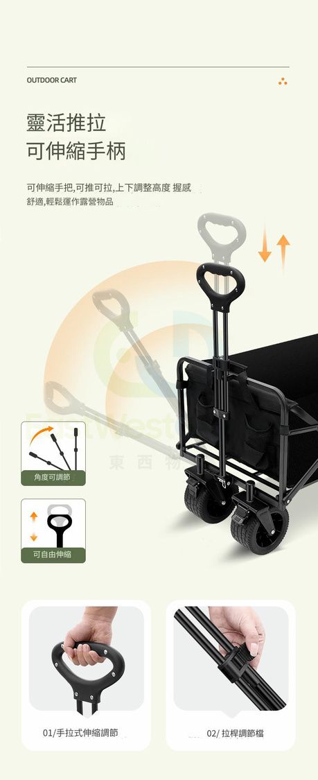 靈活推拉,可伸縮手柄,可推可拉,上下調整高度 握感舒適,輕鬆運輸露营物品