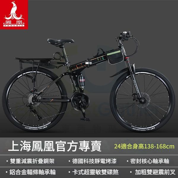 折疊單車 24英寸24速 鋼架/雙避震 輻條輪肖黑 [鳳凰正品/省力軸承]一鍵折疊 包安裝送貨-山地車 變速單車 自行車 Bicycle 腳踏車 越野單車 便攜外出旅行(N22692-13)