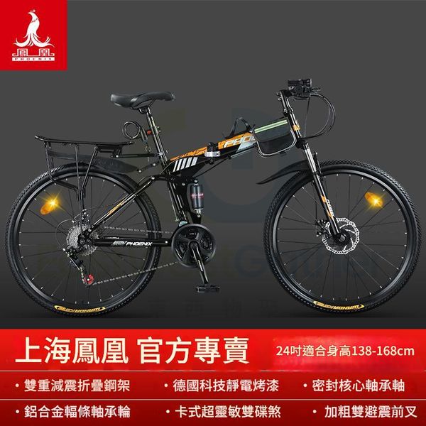 折疊單車 24英寸24速 鋼架/雙避震 輻條輪黑橘 [鳳凰正品/省力軸承]一鍵折疊 包安裝送貨-山地車 變速單車 自行車 Bicycle 腳踏車 越野單車 便攜外出旅行(N22692-22)