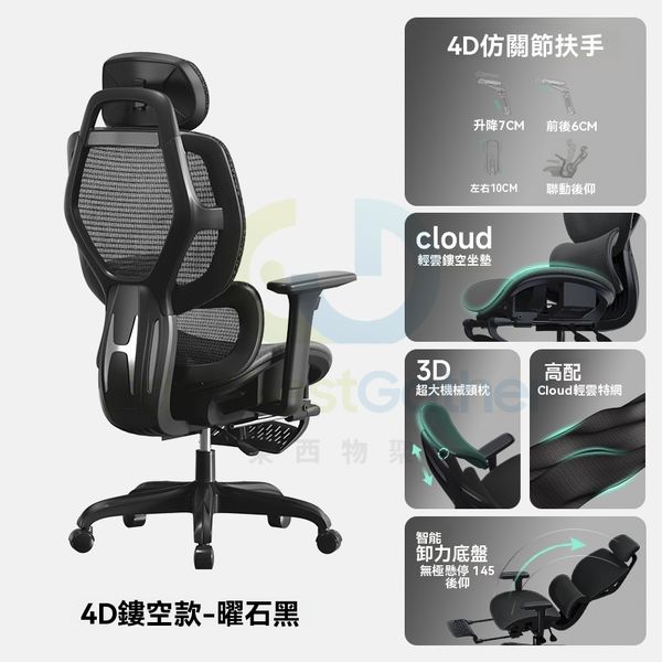 包安裝送貨-豪華款【曜石黑】透氣坐墊+高配輕雲特網+擱腳+4D扶手+四級氣杆 、尼龍腳 -電競椅 學習椅 電腦椅 辦公椅 寫字樓椅子