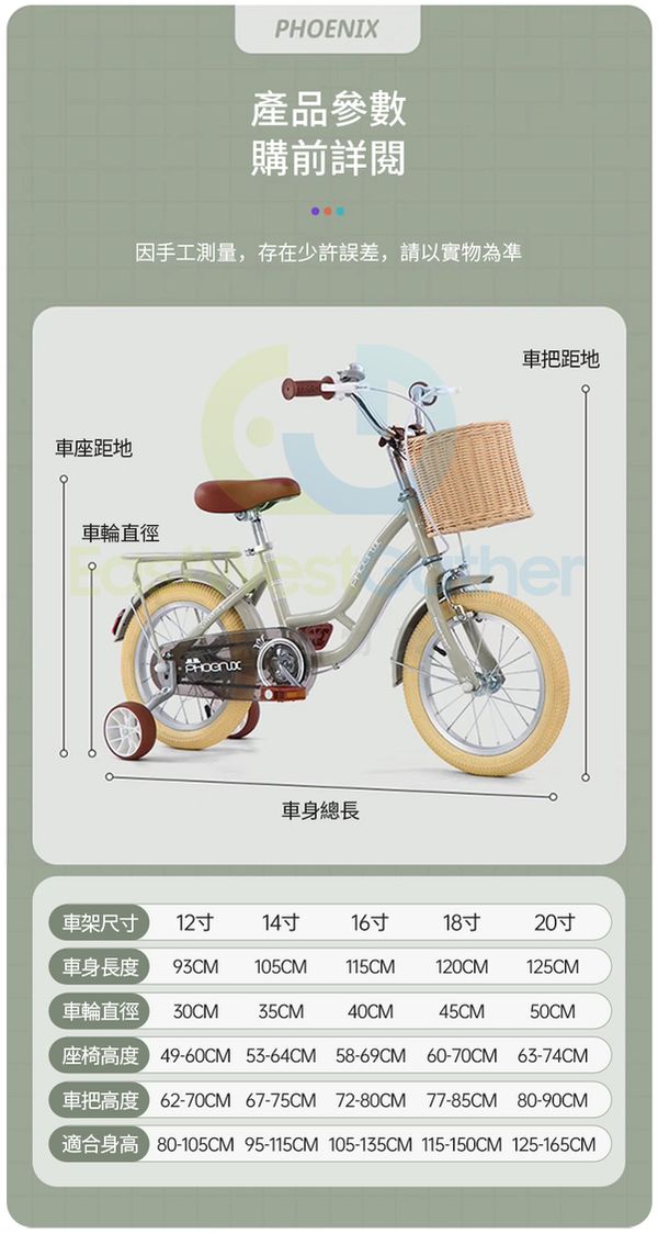 12寸-20寸多種尺寸可選,適合身高88 cm-140 cm的小朋友。