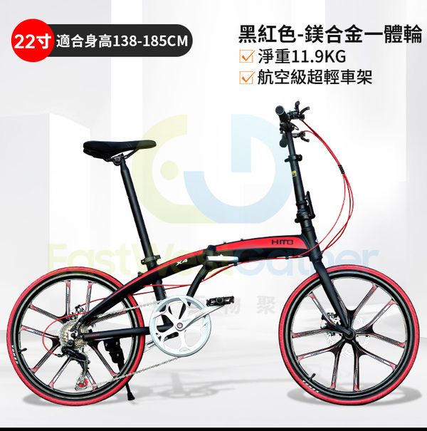 包安裝送貨-HITO-22寸-一體輪[黑紅色] -超輕便攜鋁合金骑行折疊單車 變速自行車 腳踏車(T21007-05)