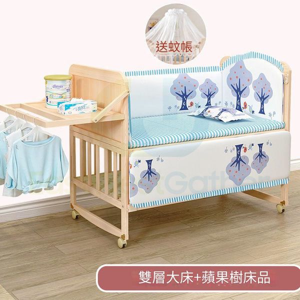 包送貨-雙層大床加長(120*67)配置物架 - 嬰兒床+床品(花色請留言) 實木新生嬰兒床 寶寶床 兒童床 BB床(T21045-112)