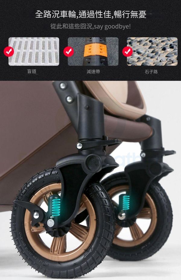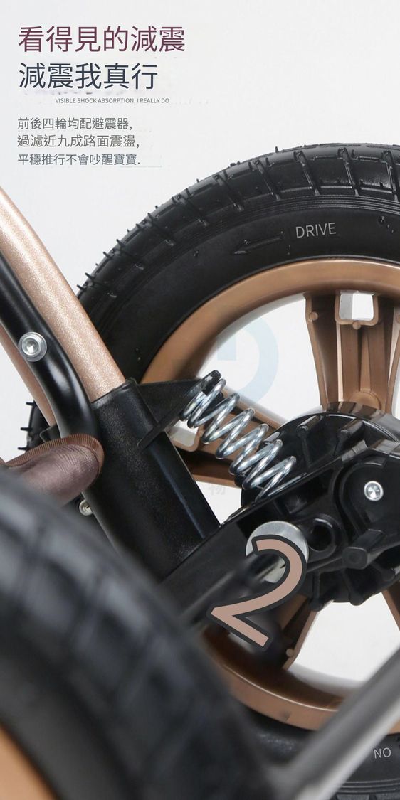 5. 前後四輪均配避震器,過濾近九成路面震盪,平穩推行,不會吵醒寶寶
