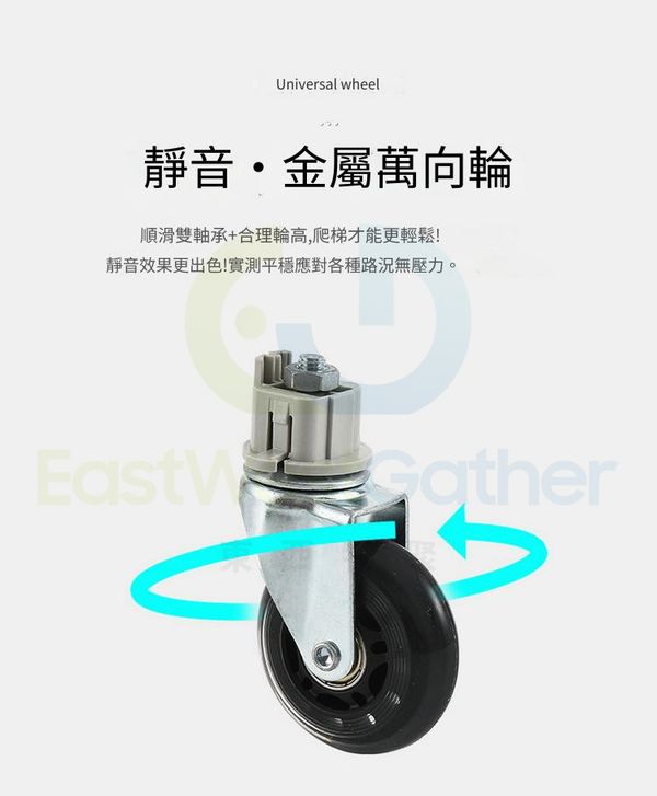 靜音金屬萬向輪,順滑雙軸承+合理輪高,爬梯才能更輕鬆!