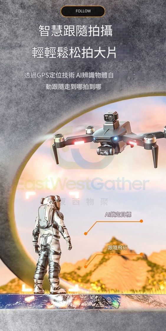 智慧跟隨拍攝:通過GPS定位技術,AI識別物體,自動跟隨,走到哪拍到哪,輕輕鬆松拍大片