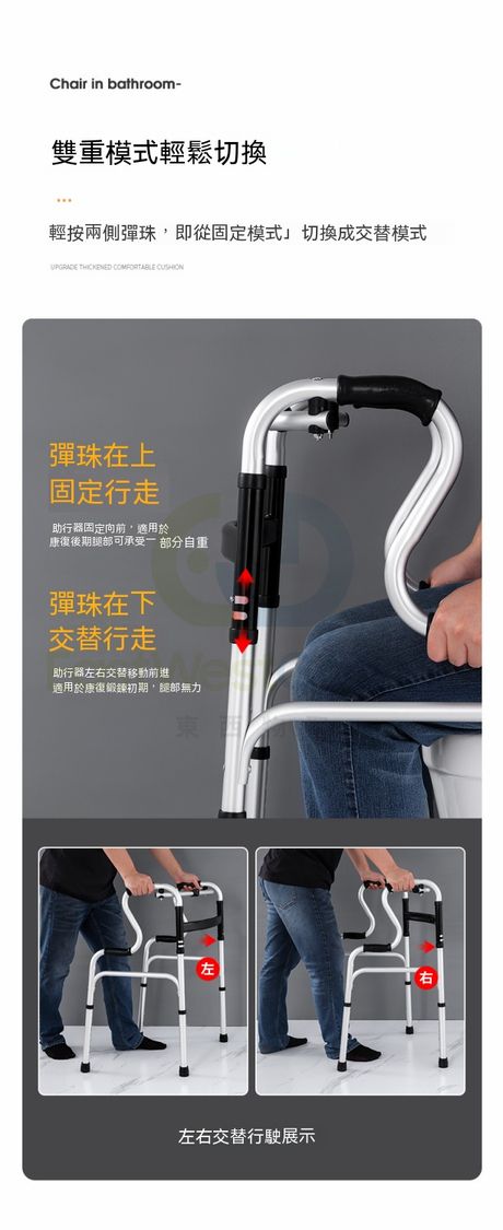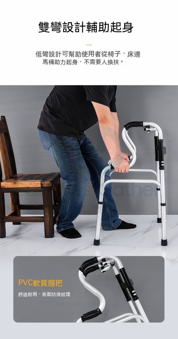雙彎設計:低彎設計可幫助使用者從椅子、床邊馬桶上輔助起身,不需要人攙扶
