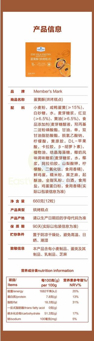 山姆直送-Member's Mark 蛋黃酥(烘烤糕點)660g(12粒)Egg yolk pastry