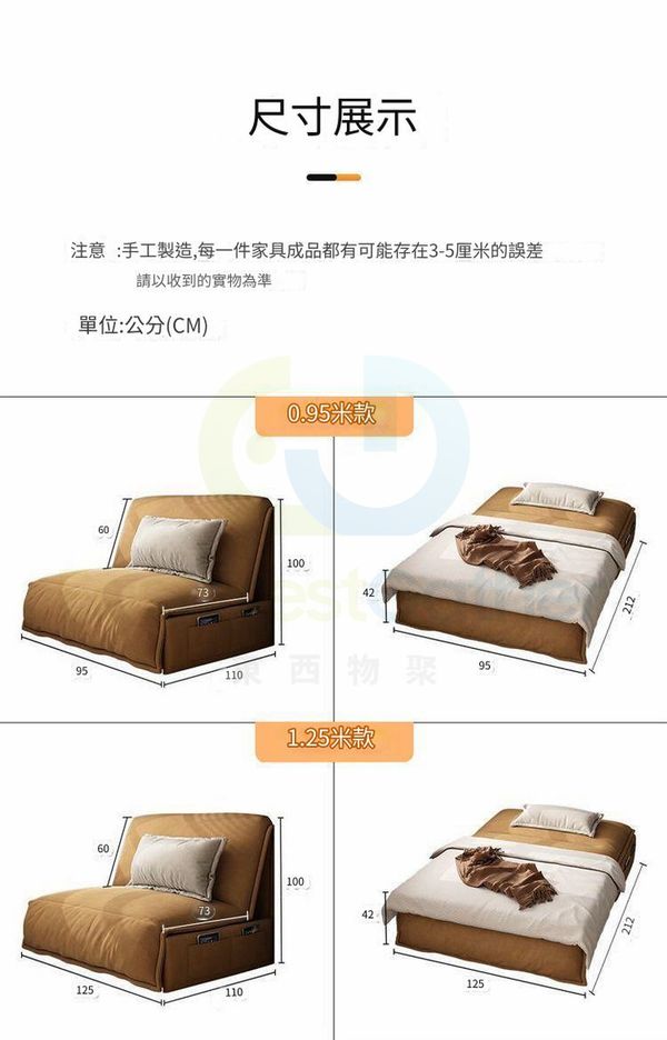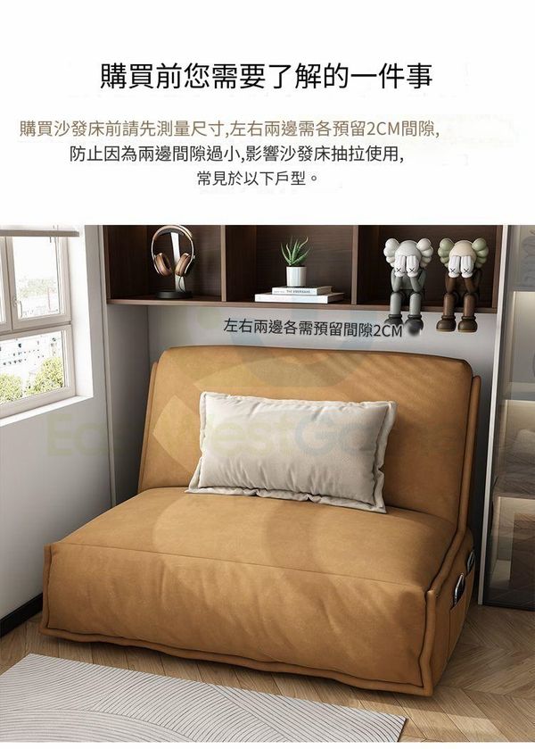 購買沙發床前請先測量尺寸,左右兩邊需各預留2CM間隙,防止因為兩邊間隙過小,影響沙發床抽拉使用。