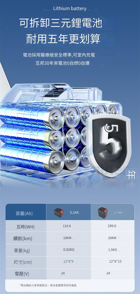 兩種充電方式,可車充/可直充,電池採用醫療級安全標準,可室內充電;可拆卸三元鋰電池,耐用更划算。