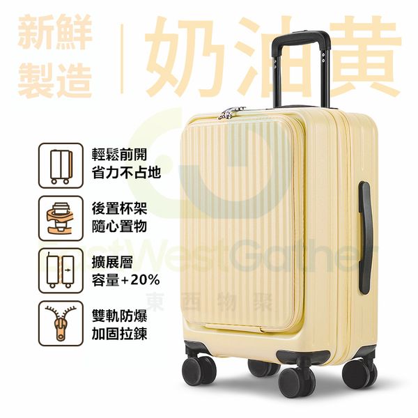 包送貨-多功能行李箱 suitcase 24寸-新一代(可擴容+雙層防爆拉鍊+杯架+掛鉤)-【忌廉黃】 前開口可擴展行李喼 旅行喼 旅行箱 拉桿箱 結婚密碼箱 登機皮箱(T22247-19)
