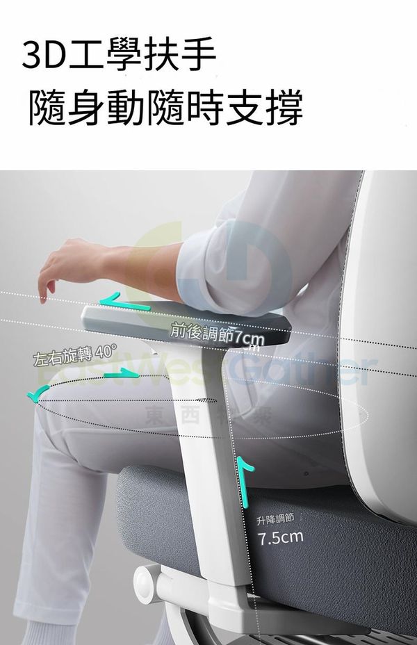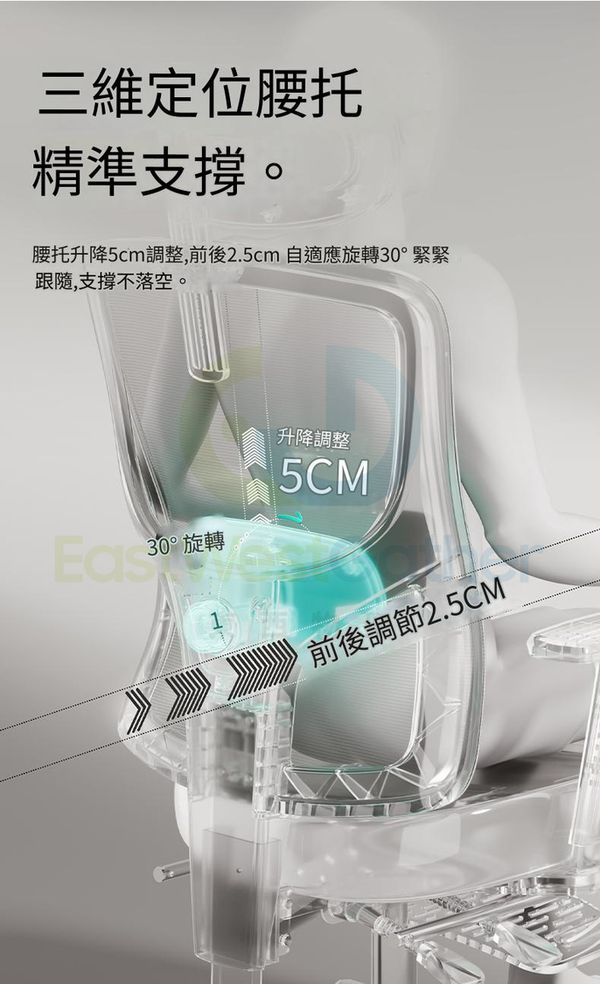 腰托升降5cm調節前後25cm自我調整旋轉30°緊緊跟隨,支撐不落空。
