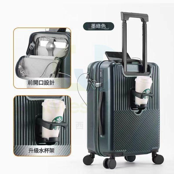包送貨-時尚輕便行李箱 suitcase 墨綠[杯架+掛鉤+前置開口]-22寸[充電接口]學生行李喼 luggage 旅行喼 旅行箱 trunk 萬向輪拉桿箱 結婚密碼箱 登機箱(T22264-57)