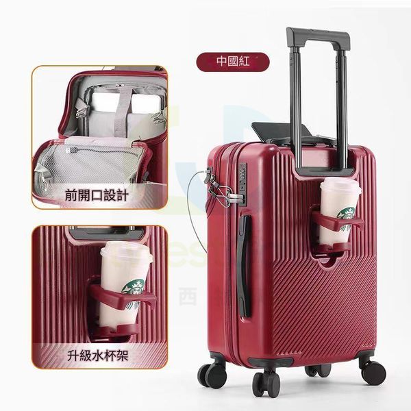 包送貨-時尚輕便行李箱 suitcase 紅色[杯架+掛鉤+前置開口]-24寸[充電接口]學生行李喼 luggage 旅行喼 旅行箱 trunk 萬向輪拉桿箱 結婚密碼箱 登機箱(T22264-73)