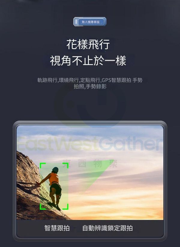 花樣飛行,視角不止於一樣,軌跡飛行,環繞飛行,定點飛行,GPS智慧跟拍手勢拍照,手勢錄影。