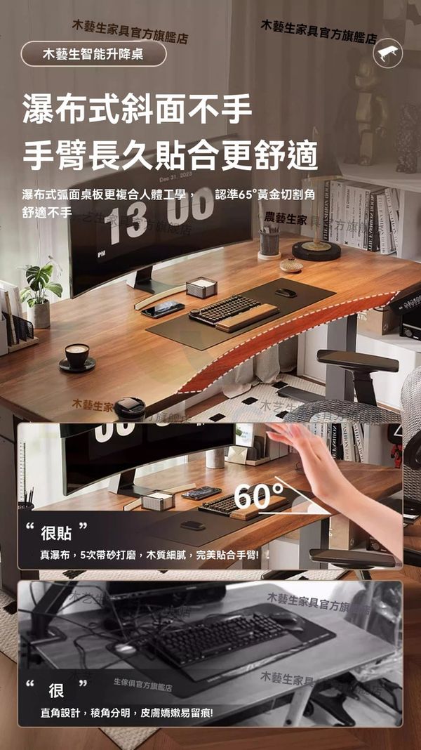 瀑布式弧面桌板更複合人體工學,認准65黃金切割角舒適不硌手。