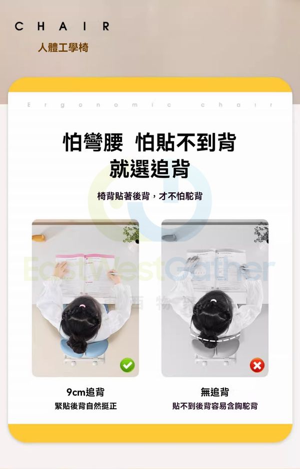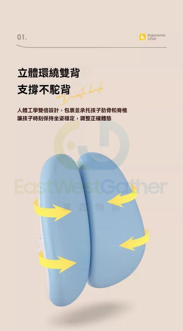 人體工學雙倍設計,包裹並承托孩子肋骨和脊椎讓孩子時刻保持坐姿穩定,調整正確體態。