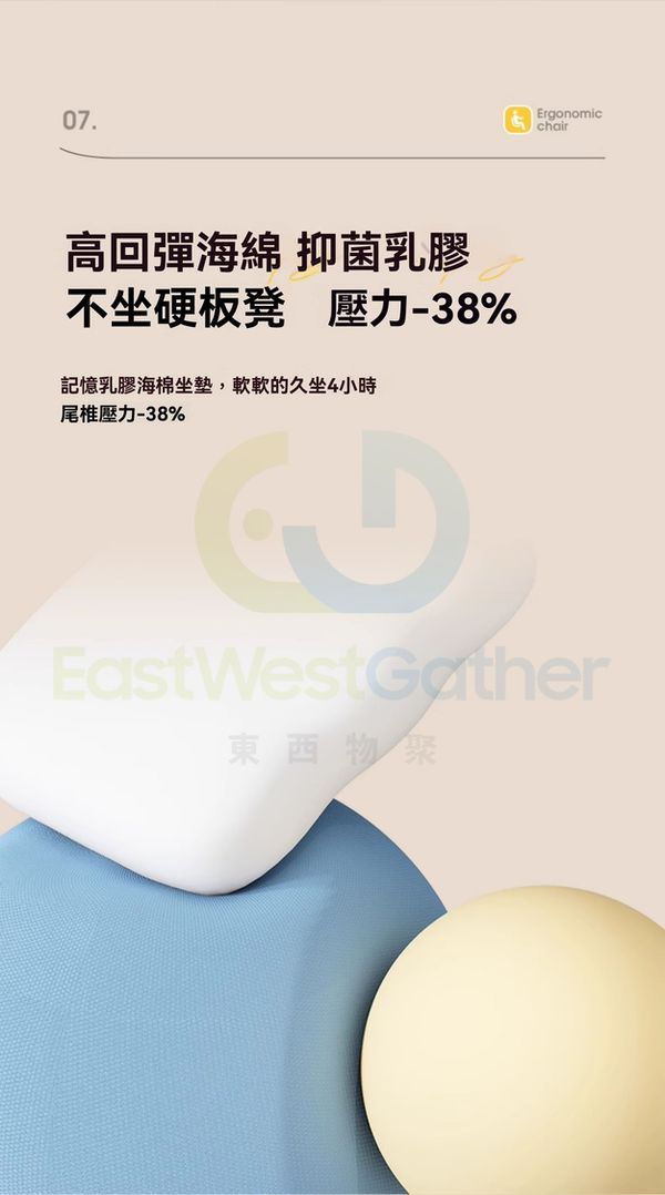 高回彈海綿+抑菌乳膠,不坐硬板凳,軟軟的久坐4小時,尾椎壓力-38%。