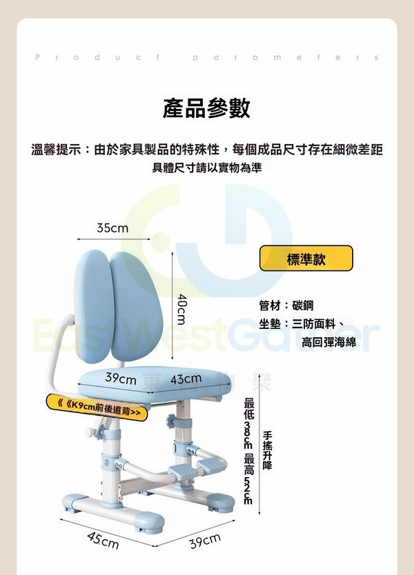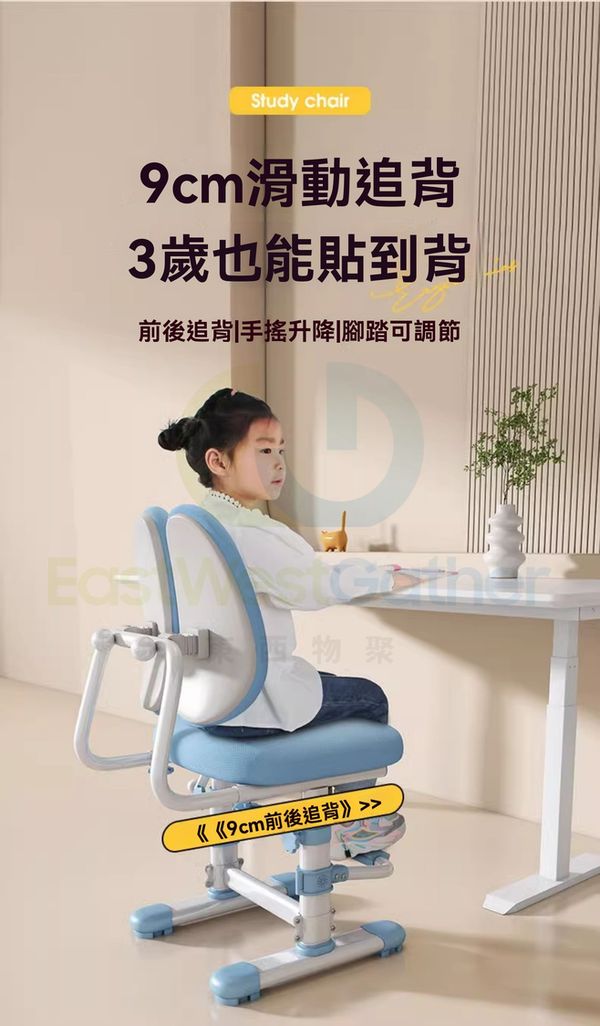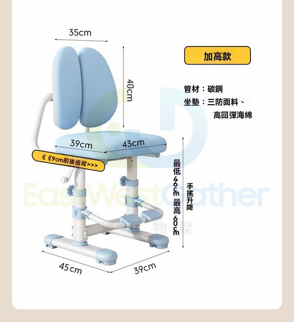 座椅可手搖升降設計,高度可調節至60cm,適配不同高度的桌子,小朋友坐著也舒服。