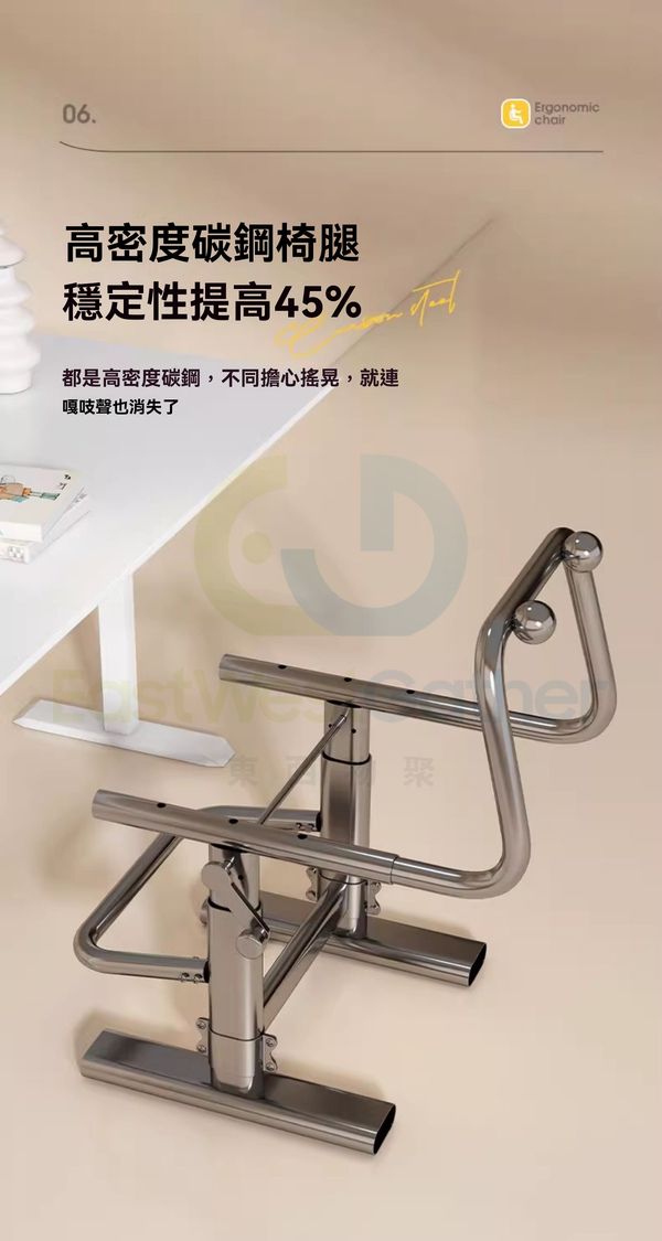 高密度碳鋼椅腿,穩定性提高45%,不同擔心搖晃,就連嘎吱聲也消失了。