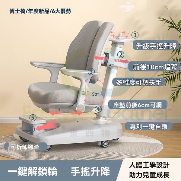 包送貨-兒童學習椅 Children's learning chair 電腦椅 【博士椅】一鍵解鎖輪/前後追背/手搖升降-灰色 可升降調節矯正坐姿寫字椅 學生椅 辦公椅(T22601-07)