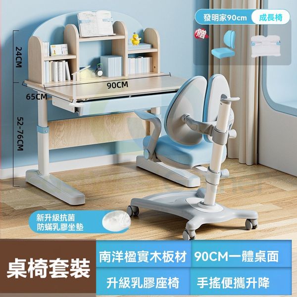 包送貨-兒童學習枱椅套裝 電腦椅 電腦枱 發明家90cm 藍色/進口實木+成長椅/防蟎乳膠+分區大書架 可升降寫字枱 學生枱椅組合 課桌椅套裝 兒童枱 兒童椅子(T22608-31)