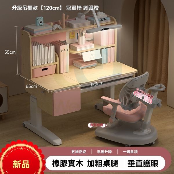 包送貨-兒童學習枱椅套裝 電腦椅 電腦枱 粉色-【升級吊櫃款】120cm+冠軍椅+AA級垂直燈 實木寫字枱 學生枱椅組合 可升降課桌椅套裝 兒童枱 兒童椅子 書枱(T22610-41)