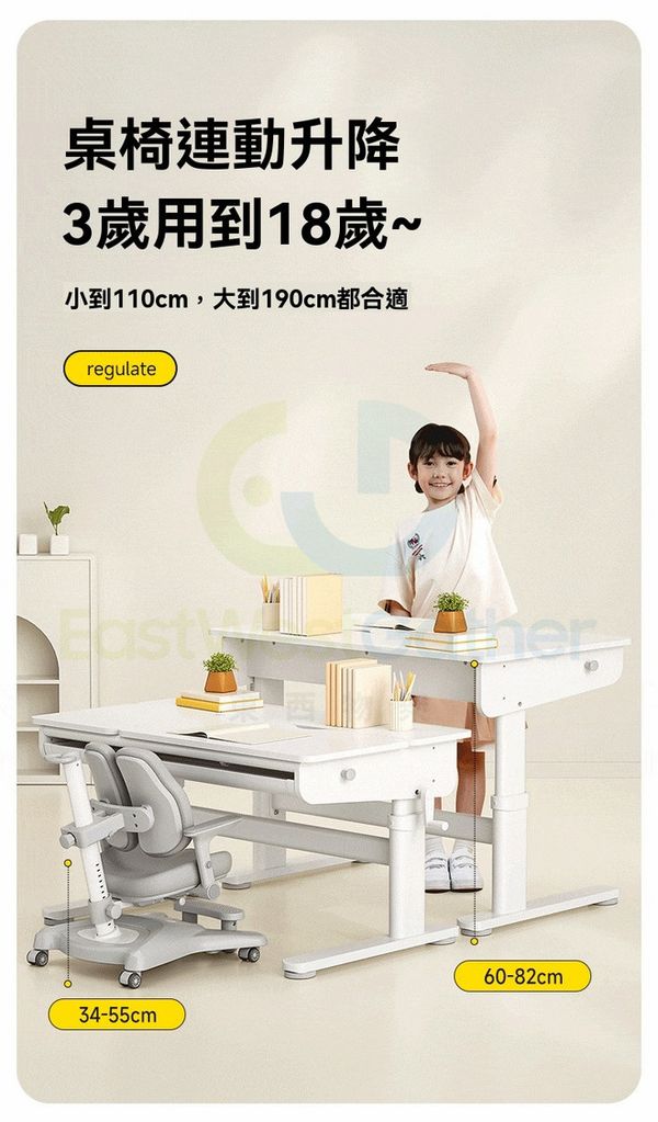 桌椅聯動升降3歲用到18歲,小到110cm兒童,大到190cm成人都合適。