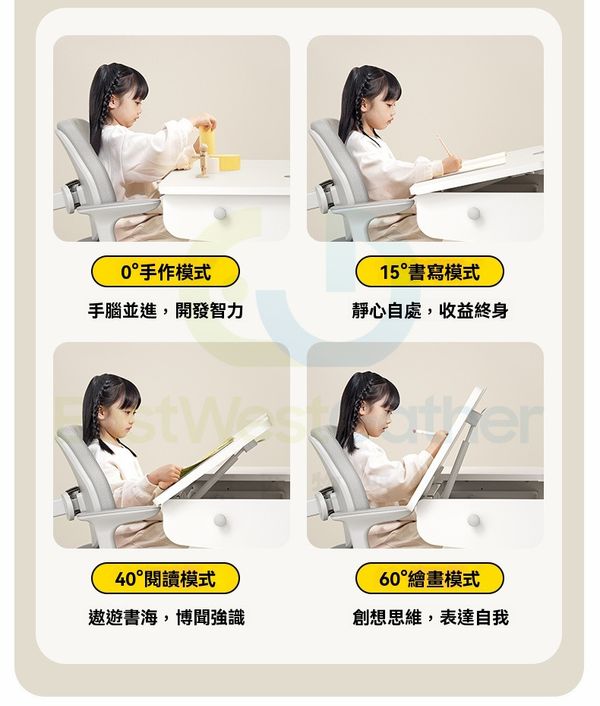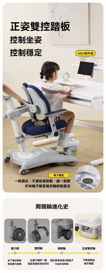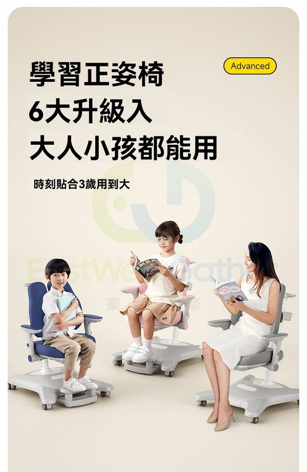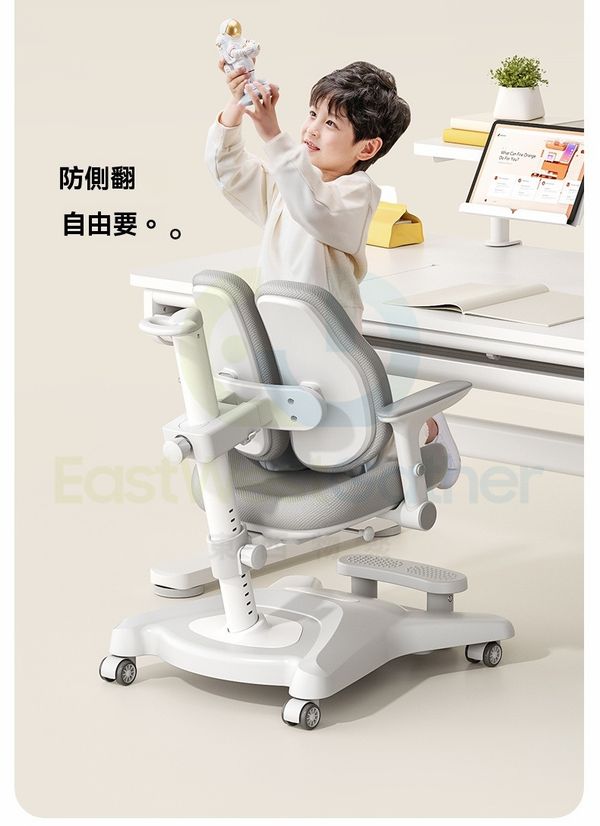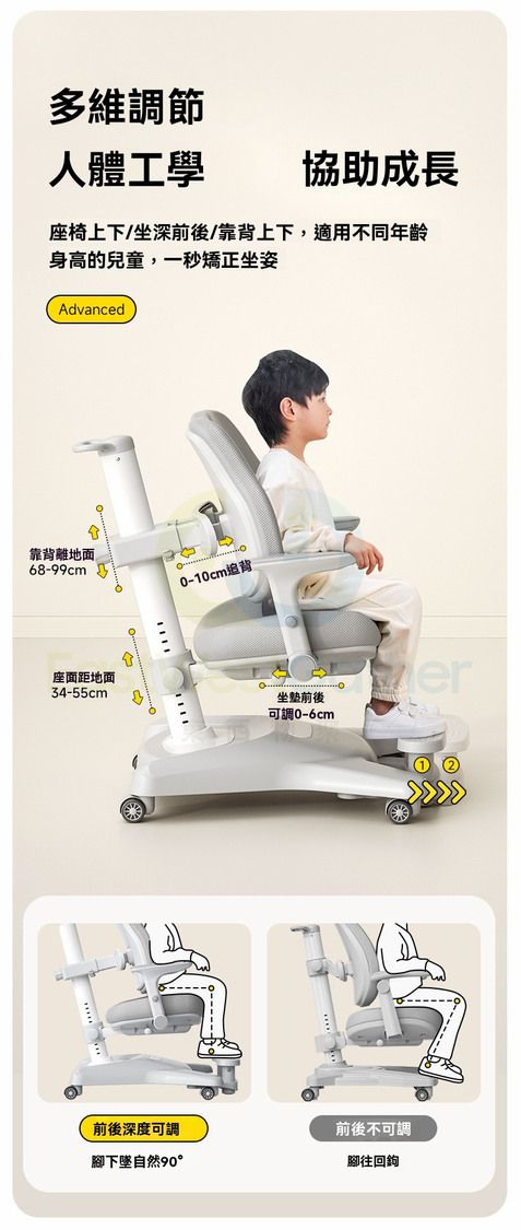 座椅上下/坐深前後/靠背上下可調節,適用不同年齡身高的兒童,一秒矯正坐姿。