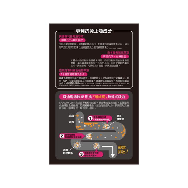 含多款專利植物成分,揉合吸油海棉技術,於腸道形成連環膳食纖維網,阻礙澱粉吸收,超強油脂吸附力,瞬間吸附及粉碎油脂,將其包裹,輕鬆排出體內。