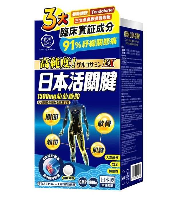 1. 「和漢匠心日本活關腱」,含1500mg高純度結晶型葡萄糖胺,結合珍貴三文魚鼻軟骨提取物 (含蛋白聚醣),有助紓緩關節疼痛不適、修補軟骨及減慢退化