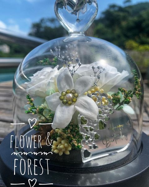 茉莉花上並以手工鑲上人工珍珠及橄欖綠硞石,更顯高貴。 心型玻璃花盅與心型生日祝賀牌,是送戀人的最佳禮
