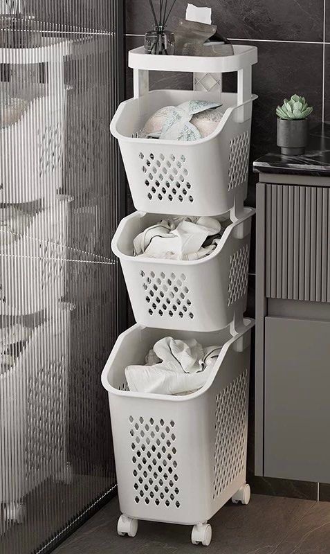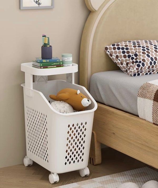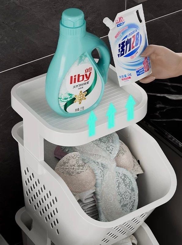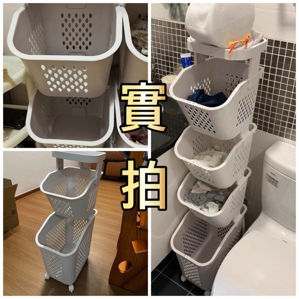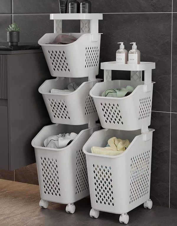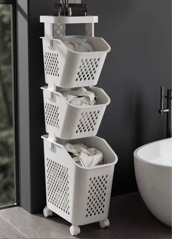 髒衣籃兼衛生間置物架,設計合理,分區放置衣物和玩具。