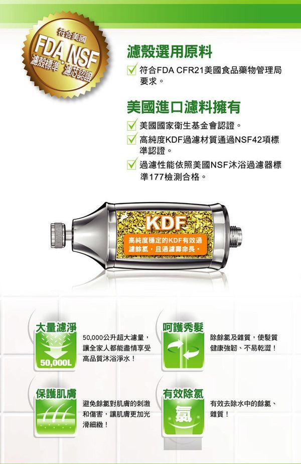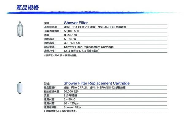 3M 沐浴過濾器 SFKC01-CN1具50,000公升超大濾量。濾材採美國進口之高純度KDF,在較高的沐浴水溫下仍可有效降低餘氯,且使用壽命長。過濾性能經美國NSF沐浴過濾器標準177檢測,濾殼選用原料符合FDA CFR 21之規範,高品質更安心。而時尚小巧的外型設計不佔空間,安裝、替換濾芯亦簡單便捷,讓全家人盡情享受高品質沐浴用水!